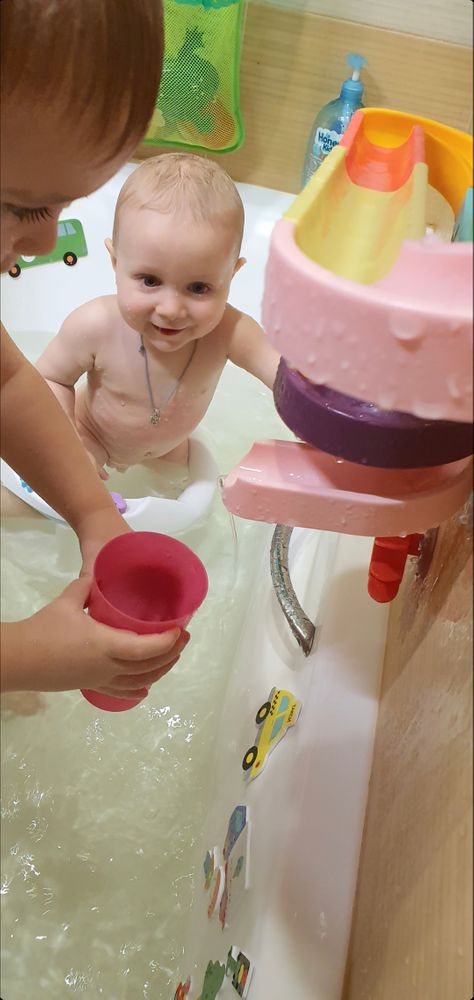 У моих стаканчики пирамидки всякие, классные стаканчики в детсире покупала, они на присосках, и по принципу пирамиды в один наливаешь воду, он сдырочками, а вдругие стаканчики стекает и крутятся вертушки