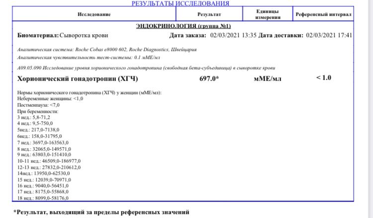 Вы беременны. Ваш хгч в графе результат: 697. Справа указаны референсные значения: <1.0