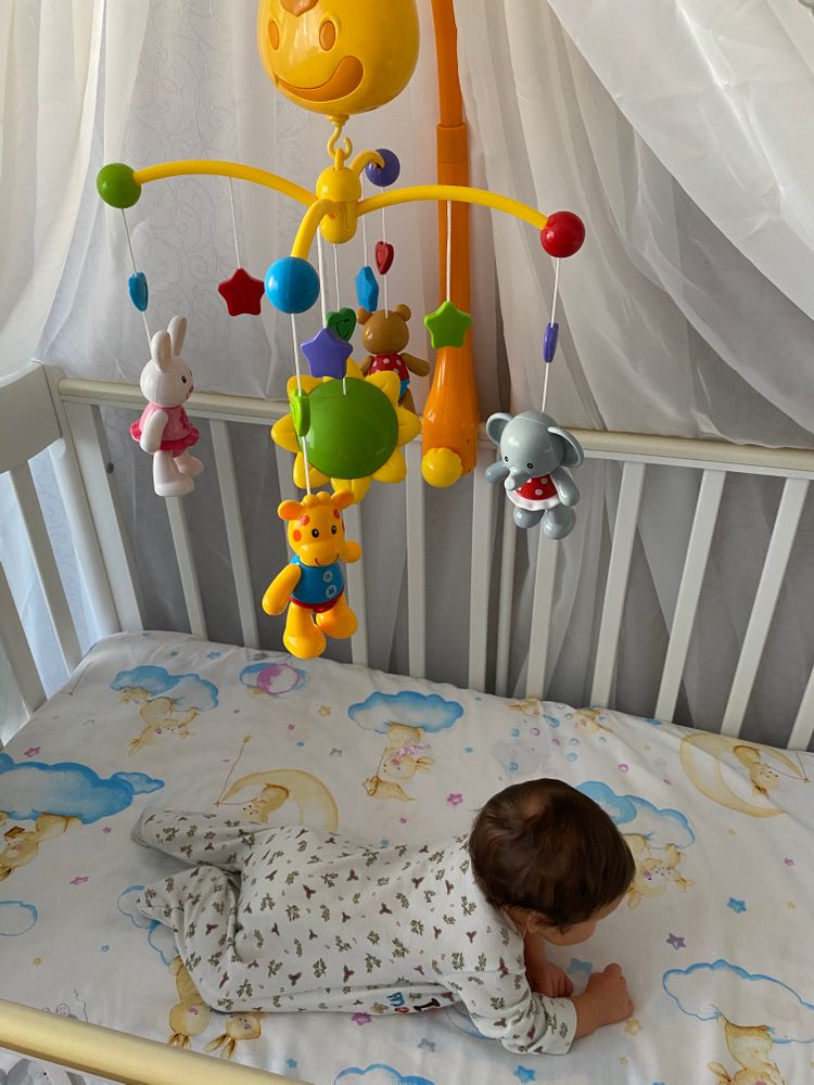 У нас ровно в месяц таак зашло , что я прям рада , я положу и он минут 30 на него залипает танцует там что то 😅 гулит и весь восторге и у меня есть 20 минут отойти поесть , душ и тд. Я взяла от компании «жирафики» он крутится , мелодии , игрушки суперские качественные , ими потом можно снимать и играть в дальнейшем, купила я его на WB за 1700, а стоил типо 3800