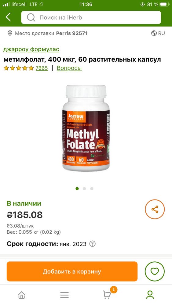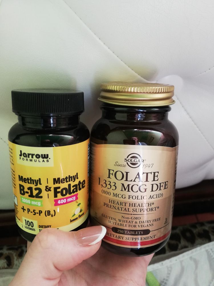 Принимаю такие же В9+В12, как на фото. Плюс еще добавила 400 мкг метилфолата от Jarrow. Снизила ими гомоцистеин с 8 до 5 (у меня есть 2 мутации в фолатном цикле, потому обычные фолиевая и В12 вообще не усваиваются).