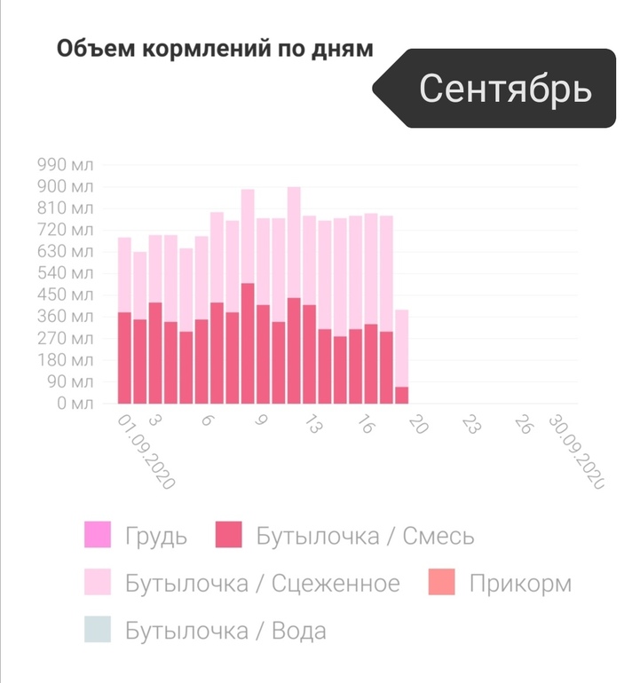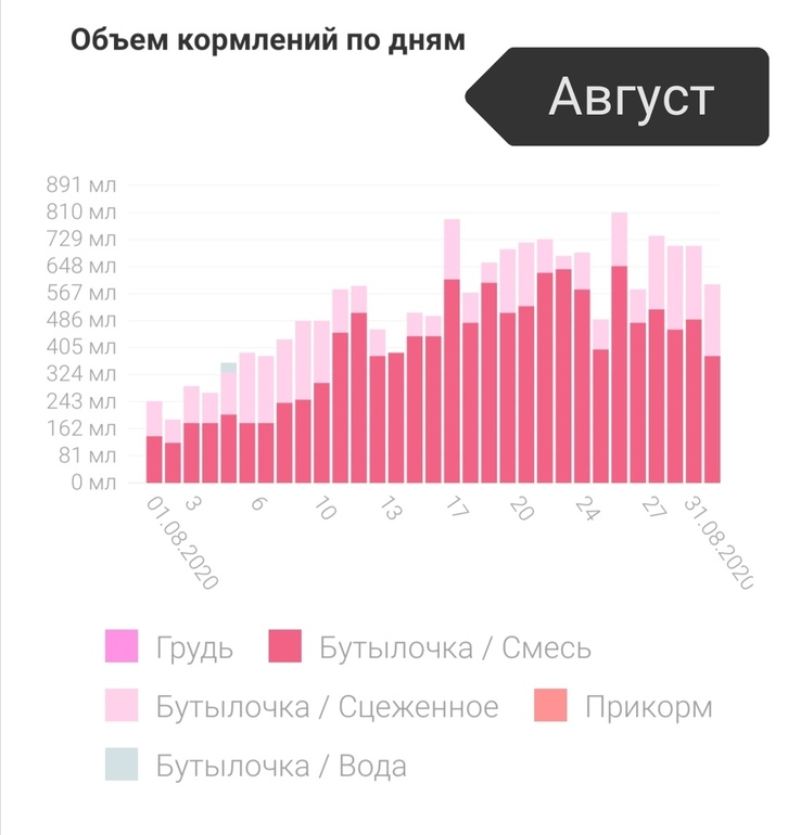 И моя самая хорошая новость - мы потихоньку уходим от смеси! Молока у меня было мало, до конца Июля ему ещё его хватало, но был немного докорм смесью. Только он растет, потребность в еде тоже растёт и что ему эти мои 20-30 мл с обеих грудей... Почти весь Август он у меня больше всего кушал смеси, молока всё было меньше. Я понимала, что ГВ приходит конец и решила, что нужно что-то делать. Случайно наткнулась у Нины Зайченко на видео "Кормление исключительно сцеженным молоком", теперь по её схеме сцеживаюсь и молока становится больше! Вот тут наглядно видно как увеличилось кол-во моего молока: