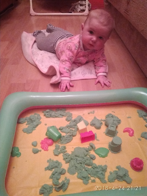 Вот и у моя Юля первый раз поиграла в песочнице. Правда дома. И песок не настоящий, а кинетический, но разве это важно?