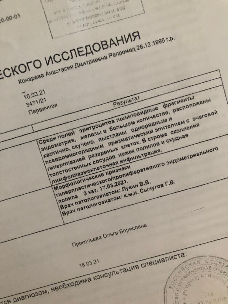 Два года назад удалили полип. Скажу сразу, я знаю, что они возвращаются. На данный момент обследуюсь у репродуктолога. Сдала гистологию, результат на фото. Уже успела расстроиться.. Сегодня 6 день цикла, пошла на узи, матка абсолютно чистая, ничего нет. Специалист (узистка) хорошая, очень долго смотрела меня. На приём пойду через неделю только. Подскажите, с чем может быть связан такой результат анализа?
