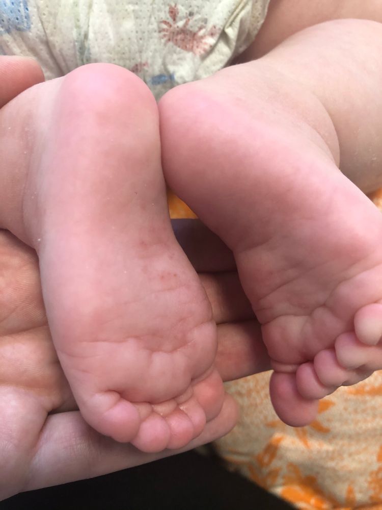 Подскажите пожалуйста у кого было такое? Маленькие прыщики на ладошках и стопах, он их не чешит. Но очень часто они потные и при этом холодные. Наш педиатр сказал что такое не видел и дал направление к дерматологу только на 25 число🤦🏼♀️