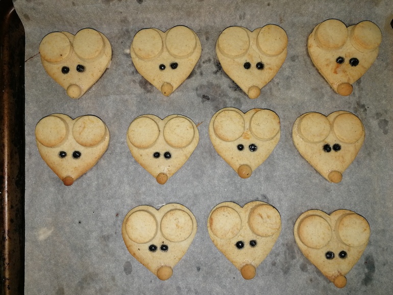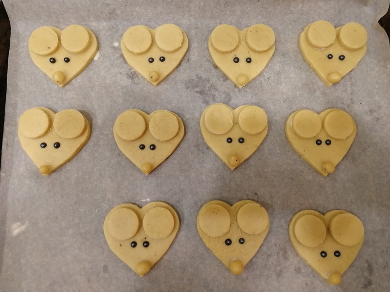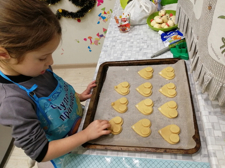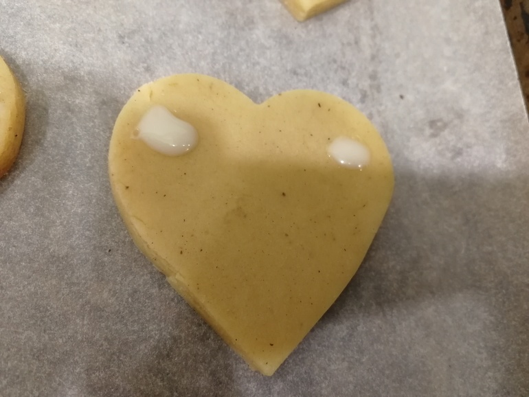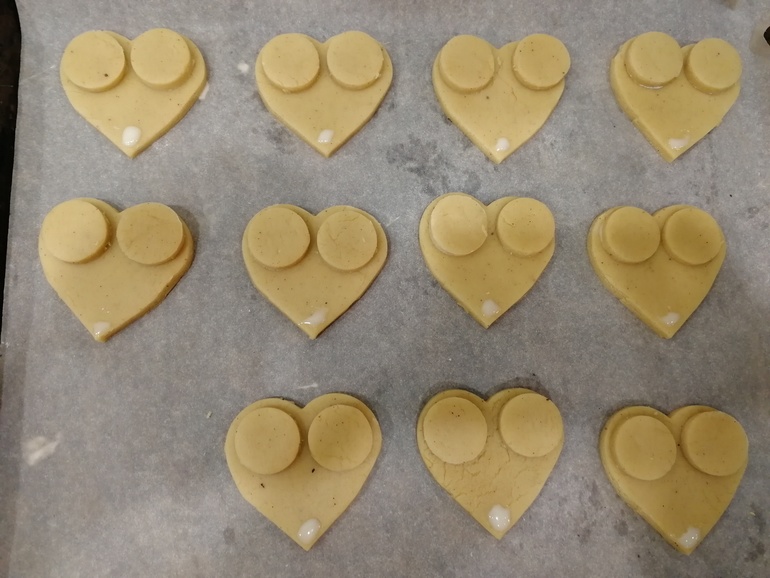 Из этого же теста вырезать кружки. Капнуть сгущенкой на верхние части сердечка: