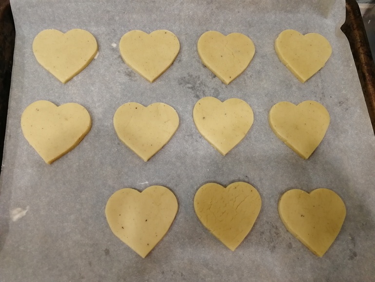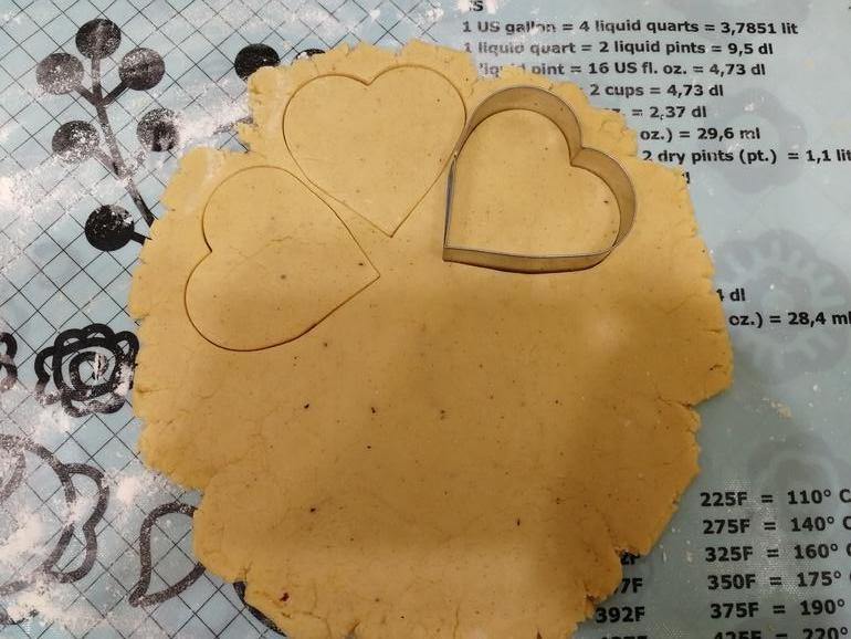 Раскатать тесто в пласт 0,5 см. Вырезать формочкой сердечки: