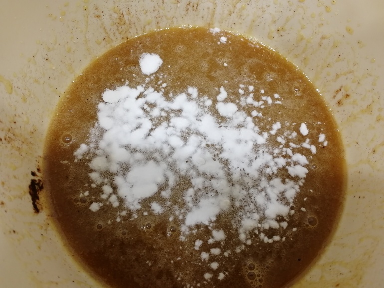 Добавить щепотку соли, 0,5 ч.л. соды, перемешать: