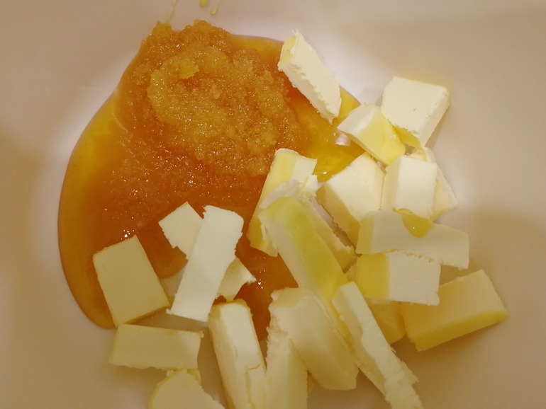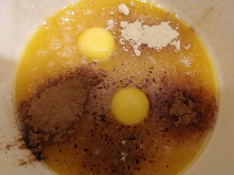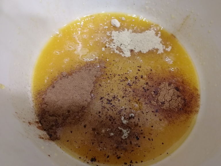 Растопить в микроволновке (или на медленном огне). Добавить 0,5 ч.л. имбиря, 0,5 ч.л. корицы, чуть мускатного ореха и молотой гвоздики: