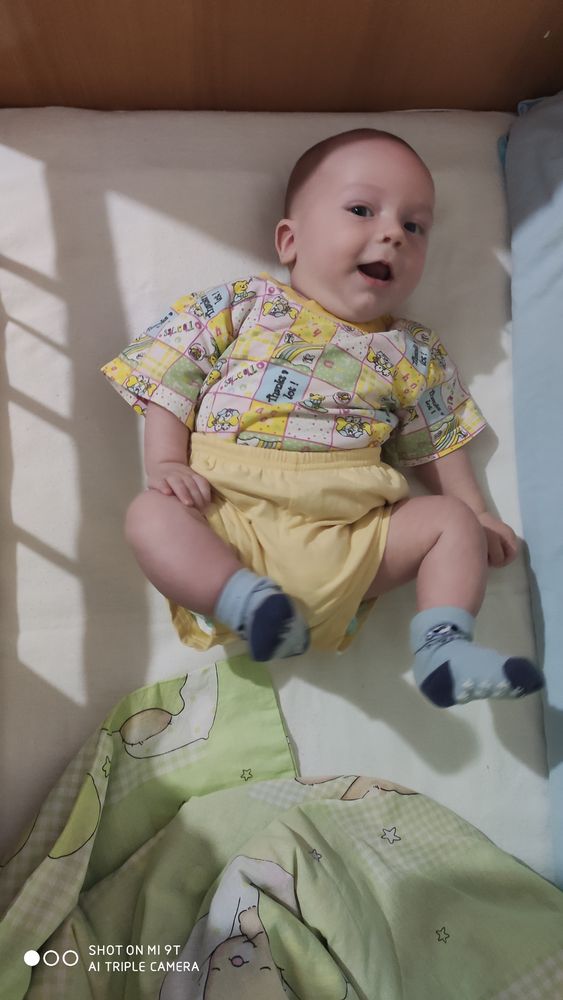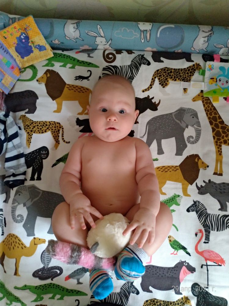☑️ Начал тянуть ножки ко рту, ещё немного и у него получится). А пока снимаем носки🤣🤣🤣.