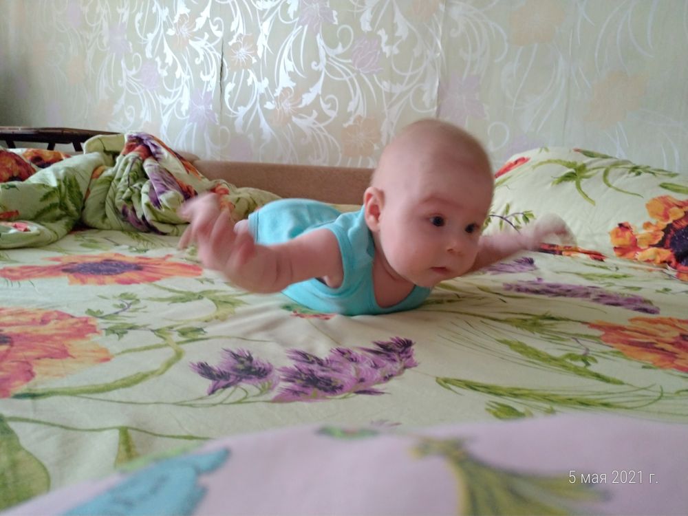 ☑️ Начал по-тихоньку передвигаться по коврику на полу, дивану, кровати. Это передвижение напоминает ползание по пластунски, но очень пока плохого качества🤣. За раз может проползти метра 2 и это здорово! Ведь теперь маме не надо мчатся, чтобы подать игрушку)!😁