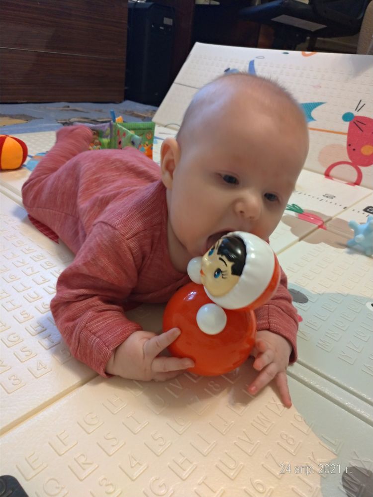 ☑️ Остальное, как и ранее: смеемся, гулим, перекладываем игрушки, рассматриваем себя в зеркало, интересуемся всем ( бирочки, ленточки, пульты, телефоны, ручные часы, кухонная утварь - это фавориты) , любим гулять в коляске на животе, любим донимать собаку🤣, все тянем в рот.