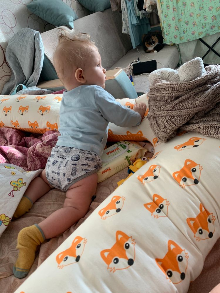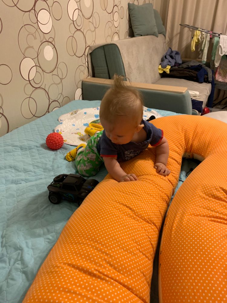 Здравствуйте! Сыну 7 месяцев. На четвереньки пока не встаёт. Пытается на них встать только тогда, когда опирается на какую-то возвышенность. Например поставит руки на какую-либо возвышенность, например на подушку и начинает поджимать ножки, как бы вставая на четвереньки, пытается вскарабкаться на эту возвышенность. При этом, когда ручки на ровной поверхности стоят, то даже не пытается, лишь иногда встаёт на прямые ручки, но ножки не притягивает. Что это значит? Как показать малышу, как вставать на четвереньки? У кого было также? Сейчас проходим курс массажа, массажист показал упражнения для четверенек, но они мягко сказать издевательские... Нужно положить малыша на животик, взять за плечики, своей головой прижать вниз его голову к поверхности и он невольно будет подтягивать ноги к животу. Ребёнок очень сильно плачет, когда делаешь эти упражнения, поэтому делать перестала. В интернете в основном упражнения на валике, но нам они не подходят, потому что в момент, когда кладёшь его животом на валик, он выгибает спину и поднимает корпус вверх расставляя руки в стороны. Подскажите, как быть? Или учить не стоит, и то, что он пытается сейчас делать (описывала выше) и есть этап перед четвереньками? Спасибо. Фото прикрепила
