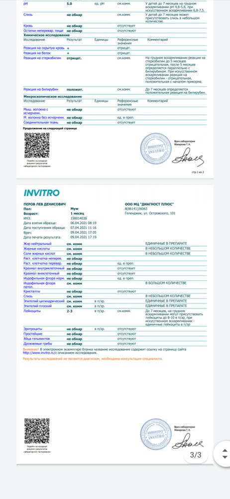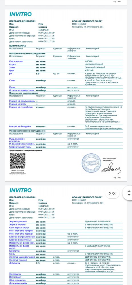 Сдали анализ на кал :углеводы и копрограмма. Углеводов не обнаружено, значит лн исключена. Лейкоцитов в кале тоже нет, значит не аллергия. Но копрограмма с вопросами, завтра пойду на платный приём повторно.