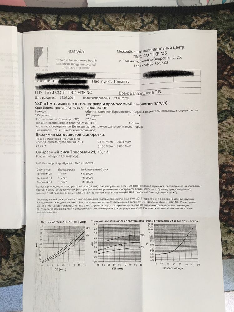 Всем привет!Пришли мне вчера результаты первого скрининга.Меня смущают цифры по ожидаемому риску трисомии.Девочки кто в этом разбирается,подскажите все ли нормально?или нужно сходить к врачу(к генетику).Очень сильно переживаю.