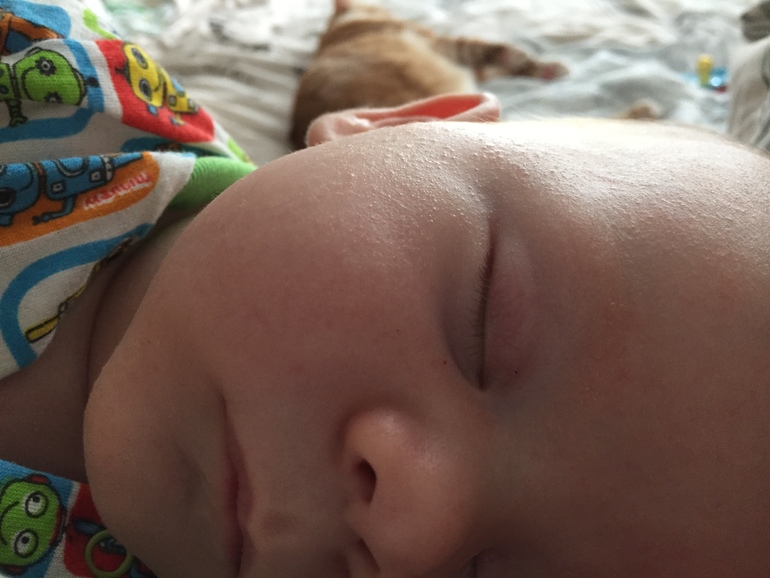 Кушаем на ночь смесь нутрилон комфорт. Может на неё...или аллергия или потница. Кормимся на локте моем, постоянно потеет от соприкосновения с личиком. Буду подкладывать пеленку. Посмотрим что изменится