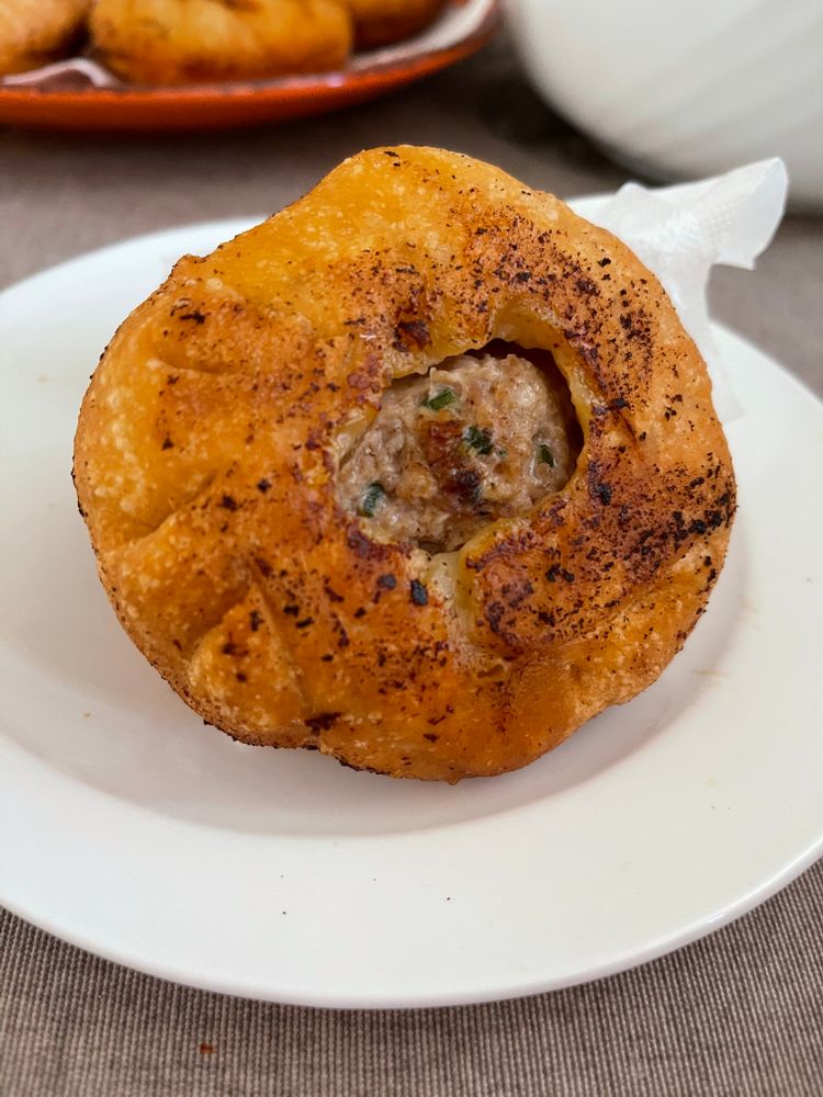 много масла на сковородку и разогреть ее. Жарить начинаю беляши укладывая дырочкой вниз! На среднем огне. Переворачиваю раза 4)