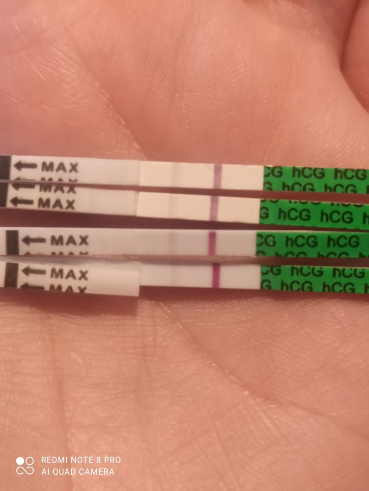 Продолжаю следить за динамикой. Верхний тест сегодня, остальные позавчера и 4 дня назад. Каждый день не стала делать, чтобы меньше расстраиваться. Кажется мы всё таки растём 😍 Сегодня вторая полоска раньше контрольной появилась, позавчера ещё так не было, вторая выходила позже чем контрольная.