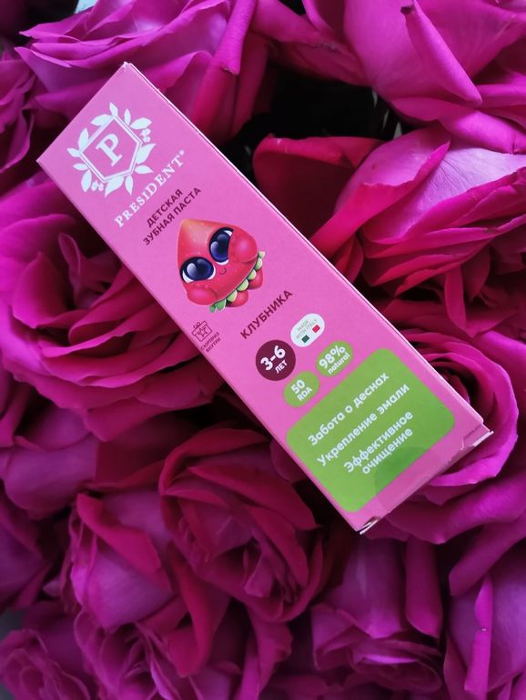 Клубничную пасту от PRESIDENT я пропустила по составу через сайт, и была удивлена, что в ней нет никаких плохих ингридиентов, ну кроме отдушки и 2 консервантов, но естественного происхождения! Пахнет паста очень вкусно, хорошо пенится, гелеобразная. Зубы очищает отлично, про защиту от кариеса не скажу, т.к пользуемся пока мало. Еще главное, у ребенка от фтора в пастах вылезает дерматит вокруг рта, тут такой ситуации нет,т.к фтора нет в составе, чему я очень рада.