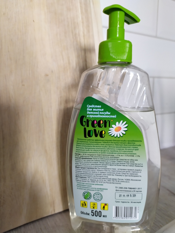 Здравствуйте. Недавно я получила на тестирование средство для мытья детской посуды Green Love. Я до последнего не знала, какое средство окажется у меня в посылке, и очень обрадовалась, когда увидела, что это :) ведь посуду дочки я мою постоянно - тарелочку, силиконовые ложки, поильник, а еще грызунки и игрушки, поэтому средство в быту мамы очень нужное. Средство для детской посуды Green Love позиционирует себя как "ЭКО- продукт", и действительно, насколько я смогла в нем разобраться, ничего страшного в составе я не увидела. Но я не специалист, для меня главное что средство оказалось полностью гипоаллергенным. Посуду, игрушки ребенка и даже фрукты я мою под проточной водой с небольшим добавлением средства, и оно полностью смывается без следа. Пенится мало, запаха и цвета не имеет никакого - мне очень это нравится! Консистенция плотная, за счет чего расходуется весьма экономично - я пользуюсь средством постоянно и за 3 недели израсходовала только четверть флакона. Однозначно буду рекомендовать его попробовать своим подругам!