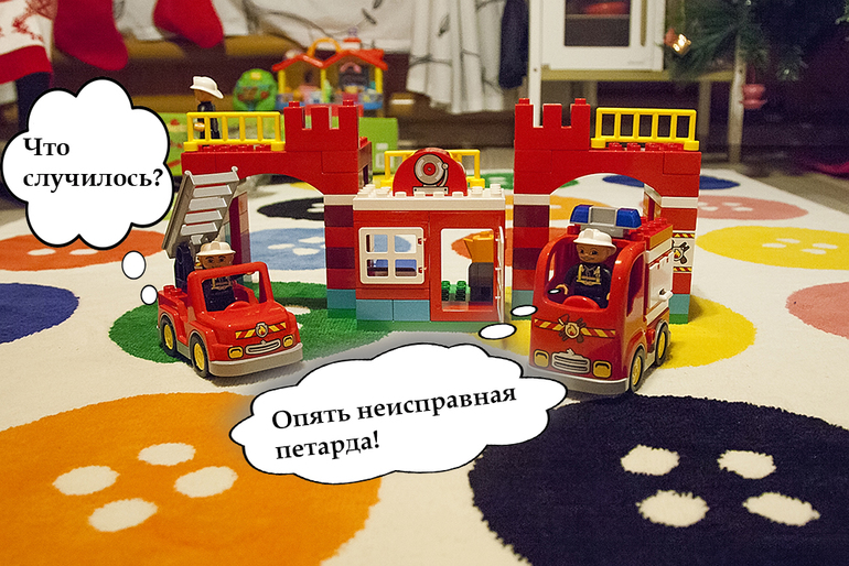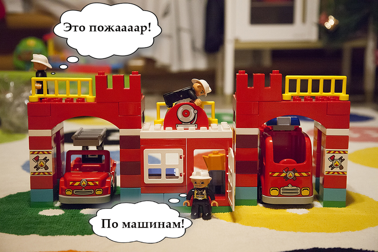 Под новый год родственники сходят с ума и начинают выполнять любые прихоти детей! Скупать все игрушки, порой совершенно ненужные, а иногда и опасные. Затмевают, своей накопленной за год пенсией, волшебство от Деда Мороза. Поэтому у нас разделены подарки, которые дарят люди и которые приносит Дед Мороз. Для всех друзей и знакомых на вопрос: «Что подарить детям?» Ответ один: LEGO DUPLO. Во-первых, можно найти наборы на любой кошелек, можно подарить один большой набор на всех или каждому по маленькому, мне не надо переживать о безопасности и не повредит ли Левику игрушка, дети всегда рады новому набору, а взрослым не надо ломать голову над выбором. Такие подарки дети получают до новогодней ночи и после нее, но в саму ночь время Деда Мороза. Первым из таких подарков в 2015-2016гг стал набор LEGO DUPLO пожарная станция. Этот конструктор не нуждается в представлении. О нем многие мечтали в 90ые, радовались пяти деталям и хранили их как сокровище. Уже в те года он имел отличительную гладкость и притягательность. Стыковка деталей не слабеет и через десятки лет. С радостью сажусь с мальчишками поиграть. Правда, я им уже и не нужна в игре. Они сами собирают по инструкции. Но я не наигралась). Лично мне кажется, что конструирование развивает логику и обучает пониманию алгоритмов, что ведет к систематизации полученной информации, и адекватному поведению в неожиданных ситуациях в дальнейшем. А когда этому обучаешься на безопасном конструкторе, приятно вдвойне. Производителю всемирно любимых «кирпичиков» я полностью доверяю, в отличие от китайских копий. Сейчас мальчишки окунаются в игру без ссор и разбирательств. Они сразу делят кому какая фигура достанется и погружают нас, взрослых, в мир своих фантазий. У мальчишек появилась новая игра с LEGO и фотоаппаратом. В мое детство не было такого большого набора лего, не было собственной камеры. Поэтому играем мы с мальчишками в новый набор вместе и не только стандартным способом. Создаем комиксы, например. Мне уже много лет интересно, кто те люди и умы, которые придумывает такие точные, простые, но оригинальные идеи? Каждая деталь имеет свое значение и место, но при этом может быть перенесена на другой «кирпичик» и опять окажется на своем месте. Машинки – любовь любого парня. А если у машинки вытягивается шланг, открывается контейнер с топором и поднимается лестница, то ее они будут носить с собой везде. «Мигалка», огонь, чайник и кроватка вдыхают жизнь в конструктор и одушевляют ситуацию. Сама станция поднимает интерес и заставляет оригинальные сюжеты рождаться прямо на глазах. В игре можно проводить сказкотерапию, обсудить волнующие вопросы ребенка, показать пример поведения в некоторых ситуациях… Хотя самый огромный плюс этого конструктора лично для меня – пару часов посидеть в тишине за компьютером с чашечкой чая, пока дети придумывают свои ситуации с персонажами.