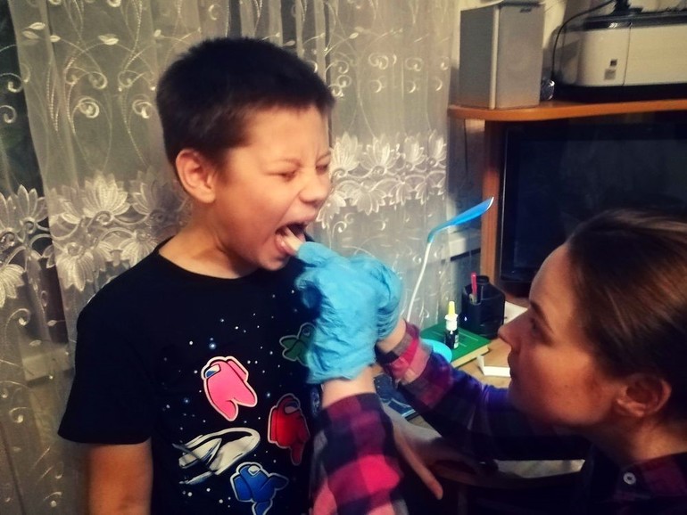 Подписав договор, начала процесс. Я села за стол, вскрыла пакет с пробиркой. Оторвала штрих-код, сперва неверно наклеила, поправила тут же, вскрыла пакет с перчатками. Они, кстати, тоже в герметичной упаковке. Надела их, достала одноразовый шпатель. В чистый подготовленный стакан я поставила пробирку (это для удобства и чтобы не разлить содержимое). Далее я взяла зонд для взятия биоматериала из горла, позвала ребёнка — первым тест сдавал он.