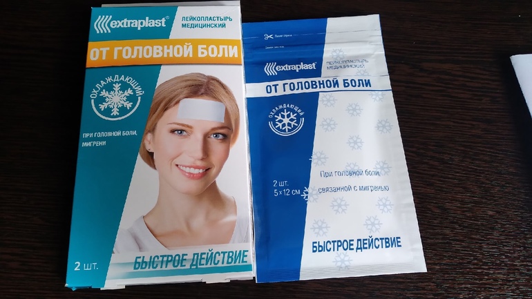 На тестирование мне прислали охлаждающий медицинский пластырь EXTRAPLAST, который показан при головной боли, мигрени. Производитель — Корея. В упаковке находится 2 пластыря размером 5×12 см, упакованные в пакет с ЗИП-замком. Это удобно, потому что можно второй пластырь надежно закрыть, чтобы не высох.