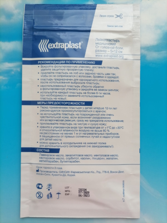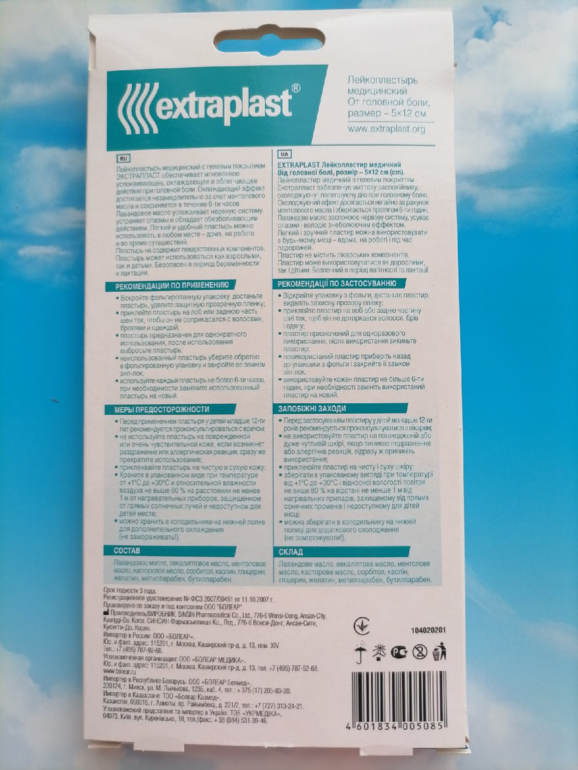 Мне удалось протестировать лейкопластырь от головной боли от extraplast. Делюсь с Вами своими впечатлениями. Начну с того, что я не любитель принимать таблетки от боли. Головную боль я обычно терпела и ждала пока она сама пройдет. Теперь же я просто использую этот пластырь и боль проходит в течении 15-20 минут полностью! Пластырь можно использовать до 6 часов и поэтому, когда у меня есть время полежать, то я его оставляю на коже. С ним также быстро засыпаешь за счёт воздействия эфирных масел. Прикреплять пластырь можно на заднюю часть шеи или на лоб, как я и делала. Эффекты, которые я отметила: охлаждающий, успокаивающий, расслабляющий, уменьшает боль и усталость, пахнет мятой. Пластырь не содержит лекарственные средства, только эфирные масла. Сам он гелеобразный, прям некая "желешка". С ним можно ходит и он никуда не сползет. Упаковка фольгированная, в ней 2 пластыря, оснащена зип-локом для удобного использования. Для увеличения эффекта упаковку храню в холодильнике. Могут использоваться при беременности и лактации. Результатом действия пластыря я довольна, буду рекомендовать друзьям и покупать ещё!