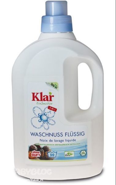 - Klar жидкое средство для стирки Мыльный орех 1.5 л, 952 руб. Также замечательное средство, без запаха. Бутылки хватает где-то на 1,5 месяца.