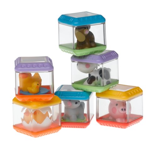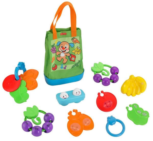 Набор включает в себя сумку с кнопкой-яблочком, нажимая на которую, ребенок прослушает забавные песенки. В сумке есть четыре веселые игрушки, каждая с уникальной особенностью. Это и красочная погремушка-овощи на колечке, состоящая из моркови, помидора и гороха. И фиолетовый виноград, ягоды-шарики которого можно перемещать по виноградной лозе. И пять желтых бананов. И два улыбающихся яйца, которые переключаются вверх и вниз при нажатии.