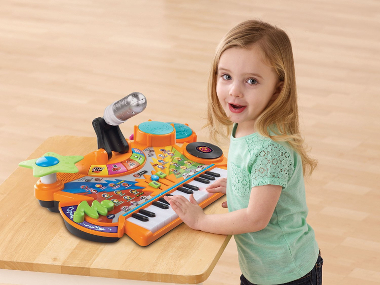 Играют более 130 песен , мелодий , звуков и фраз, мигает световой индикатор. Поверните вращающийся диск для того чтобы послушать веселую песенку.