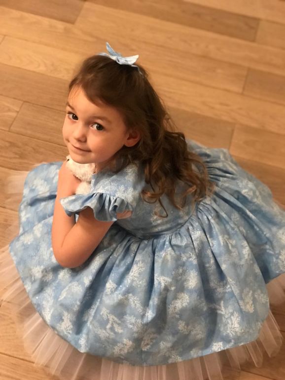 На 8 марта в детском саду был День бантиков. Надо было прийти с большими бантами. Мы с Анютой бантики сделали сами, к сине-белому платью. Один на голову, и один в качестве браслета