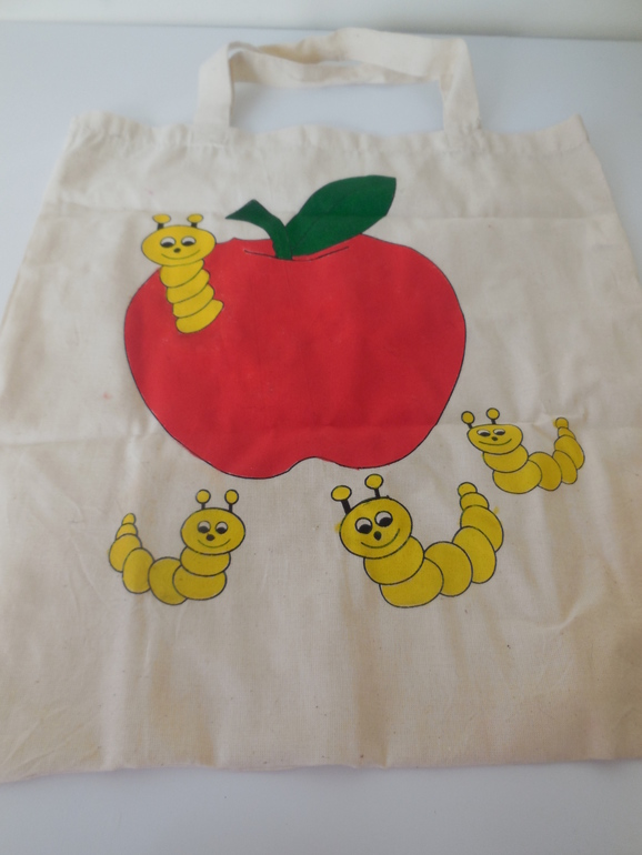 А вот так Леночка показала как можно расписать изделие из ткани красками, вот например сумка на которой она нарисовала Яблочко и забавных червячков: