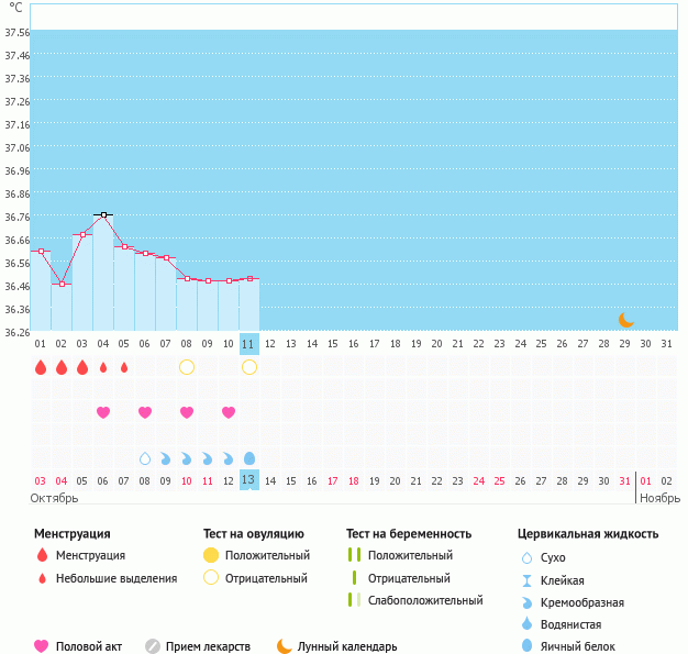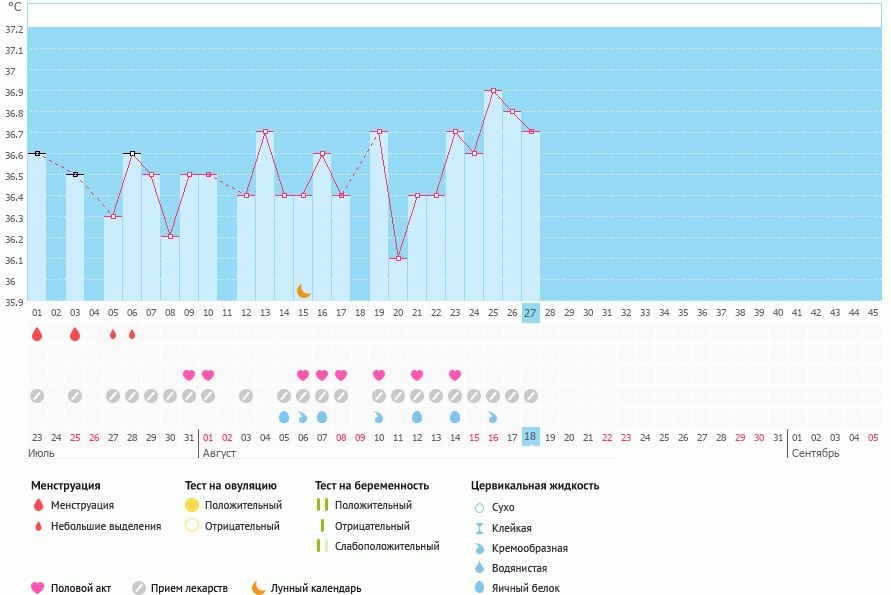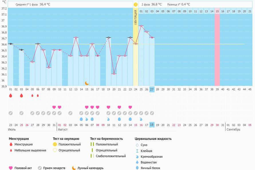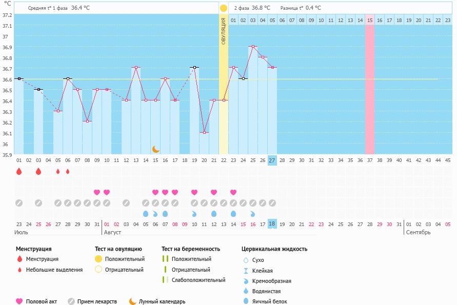 Первый цикл на фертине и впервые не могу понять, когда была О. БТ измеряю орально, она у меня обычно ниже ректальной на 0,2. Незадолго до О моя бт всегда делает скачок вверх (!). Всегда у меня О поздняя (28-35дц), а тут пораньше, но симптомы слабее. ЯБ был скудный, отмечен на графике. Характерная боль в боку была в пятницу вечером (обычно она у меня сильная, сразу с утра на следующий день после О), но в этот раз была слабее. Выделения крем уже в субботу вечером точно были. Тесты в этот раз не делала. Смущает низкая бт второй фазы, обычно разница хорошая и бт не скачет, а тут ерунда какая-то. Жду ваши комментарии, что думаете, когда была О и что вообще думаете по графику