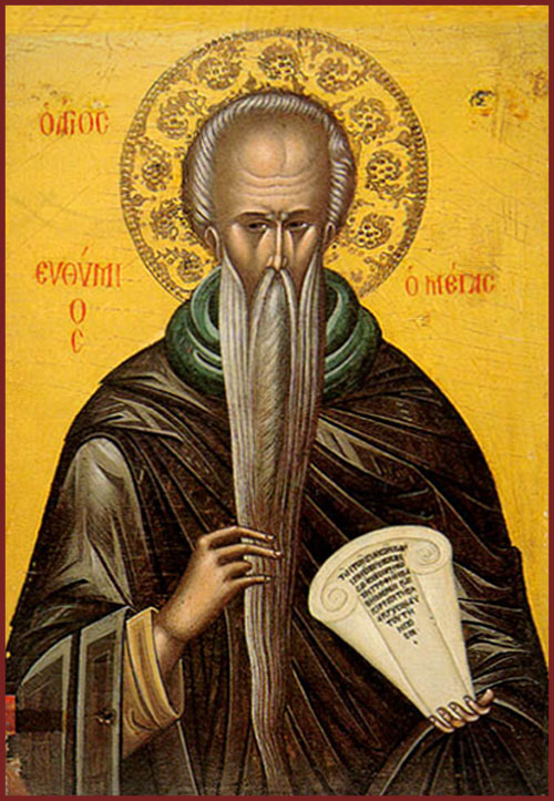 Преподобне отче Евфимие! Воззри на нас милостивно и к земли приверженных возведи к высоте небесней. Ты горе на небеси, мы на земли низу, удалены от тебе, не толико местом, елико грехми своими и беззаконии, но к тебе прибегаем и взываем: настави нас ходити путем твоим, вразуми и руководствуй. Вся твоя святая жизнь бысть зерцалом всякия добродетели. Не престани, угодниче Божий, о нас вопия ко Господу. Испроси предстательством своим у Всемилостиваго Бога нашего мир Церкви Его, под знамением креста воинствующей, согласие в вере и единомудрие, суемудрия же и расколов истребление, утверждение во благих делех, больным исцеление, печальным утешение, обиженным заступление, бедствующим помощь. Не посрами нас, к тебе с верою притекающих. Вси православнии христиане, твоими чудесы исполненнии и милостями облагодетельствованнии, исповедуют тя быти своего покровителя и заступника. Яви древния милости твоя, и ихже отцем всепомоществовал еси, не отрини и нас, чад их, стопами их к тебе шествующих. Предстояще всечестней иконе твоей, яко тебе живу сущу, припадаем и молимся: приими моления наша и вознеси их на жертвенник благоутробия Божия, да приимем тобою благодать и благовременную в нуждех наших помощь. Укрепи наше малодушие и утверди нас в вере, да несомненно уповаем получити вся благая от благосердия Владыки молитвами твоими. О, превеликий угодниче Божий! Всем нам, с верою притекающим к тебе, помози предстательством твоим ко Господу, и всех нас управи в мире и покаянии скончати живот наш и преселитися со упованием в блаженныя недра Авраамова, идеже ты радостно во трудех и подвизех ныне почиваеши, прославляя со всеми святыми Бога, в Троице славимаго, Отца и Сына и Святаго Духа, ныне и присно и во веки веков. Аминь.