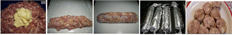 300 г мякоти свинины 1 крупный окорочек 150 г куриной печени 150 г вареных куриных желудочков 2 молочные сосиски 8 яиц 8 столовых ложек манки Соль, молотый черный перец, лавровый лист, паприка, сухие грибы и пр. Удобнее всего будет нарезать подмороженные продукты. Свинину нарезать мелкими кубиками Курицу освободить от костей. Нарезать вместе с кожицей Сосиски мелко нарезать Печенку мелко нарубить Измельчить вареные пупки Лук очистить и мелко нарезать Вбить все яйца Всыпать манку Посолить, поперчить, добавить любые специи и травки на ваш вкус Массу тщательно перемешать Рабочую поверхность застелить пищевой пленкой. Край не отрезать На край пленки выложить 6-7 столовых ложек массы Края пленки подвернуть, формируя колбаску и продолжать обматывать пленкой колбасу (до 10 слоев). Край отрезать и плотно зафиксировать Таким образом упаковать всю массу. Обычно получается 4-5 колбасок В большой кастрюле вскипятить воду со специями. Я еще добавляю сухие грибочки Колбаски опустить в кипящий отвар (лишнюю воду можно слить). Убавить огонь, нагрыть крышкой Варить около 1,5 часов. Остужать колбасу в отваре Полностью остывшую колбасу вынуть из бульона и поместить в холодильник минимум на 3 часа Готовую колбасу можно хранить в морозилке и доставать по мере надобности. Ножницами освободить от пленки Нарезать ломтиками и оформить зеленью и овощами