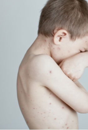 Сыпь не имеет определенной локализации, часто элементы сыпи можно обнаружить на волосистой части головы, слизистой оболочке рта, глаз, половых органов. Характер высыпаний меняется по ходу болезни: слегка выступающие над кожей красные пятна за несколько часов превращаются в пузырьки с прозрачным, затем мутнеющим содержимым. Размер ветряночных пузырьков не более 4-5мм. В дальнейшем они подсыхают и на их месте образуются буроватые корочки. Каждый элемент в течение 3 - 6 дней претерпевает эволюцию: пятно-везикула-корочка. Сыпь при ветрянке всегда сопровождается зудом. Очень важная особенность этого вида сыпи - подсыпания (появление новых элементов), чему нередко сопутствует очередной всплеск температуры. Типичными элементами сыпи при ветряной оспе являются везикулы размером от 1 до 5 мм, имеют пупковидное втяжение в центре везикулы.