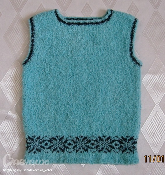 Простенькая совсем... Выполнена спицами, без описания. Схему рисунка взяла в интернете. Основной узор - лицевая гладь, снизу резинка 2 х 2, вырез горловины и вырез для рукава тоже резинка 2 х 2. Использована фантазийная пряжа.