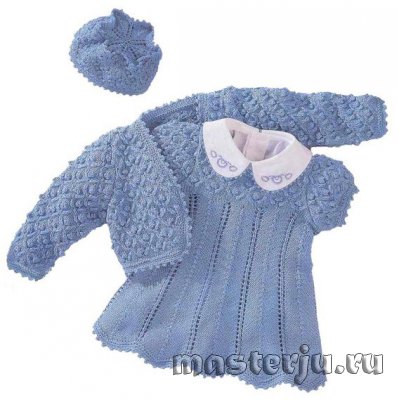 Пряжа Анни Блатт Луксор цвета незабудки 358 для платья 4 (4/5) мотка, для болеро 3 (3/4) мотка, для шапочки 1 моток. Спицы №3,5, вспом. спица, крючок №3, 5 пуговиц.