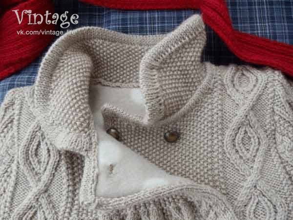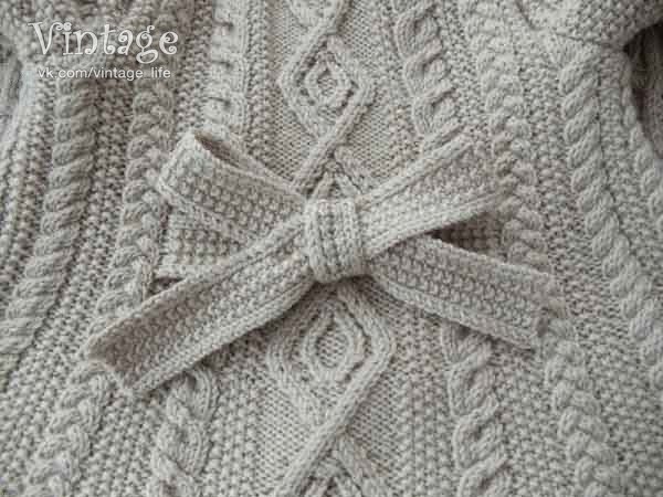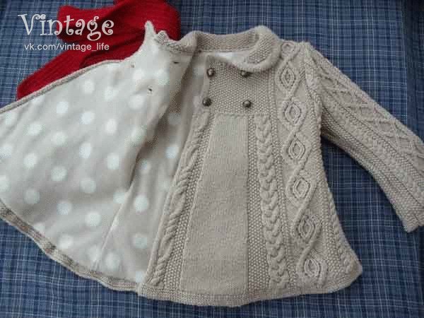 Еще одна вязаная детская вещь, мимо которой нельзя пройти мимо. Прекрасное пальто связано спицами по мотивам модели Ральфа Лорена. Схемы жгутов описаны словами, центральный аран также выполняется по схемам. Справа и слева от него косички.