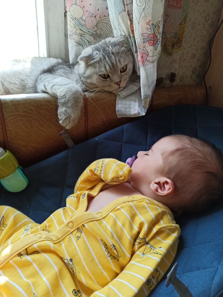 Дома ей стали интересны кошки. Она им тоже. Теперь, когда Ди мандрагорит в позе сфинкса на полу, так как хочет ползти, но не получается, к ней прибегает Бася и растягивается рядом. Моральная поддержка 10 из 10