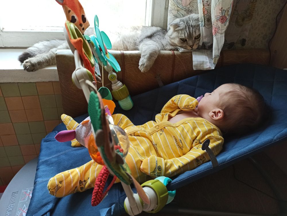 Потихоньку получается готовить спокойно, сажаю мелкого в бэби борн , он там может просидеть часами, поспать там. Но надо подходить к нему и общаться, иначе начинает скучать. Отлично играет на игровом коврике, смотрит на мобиль в кроватке, слушает как поёт папа ))