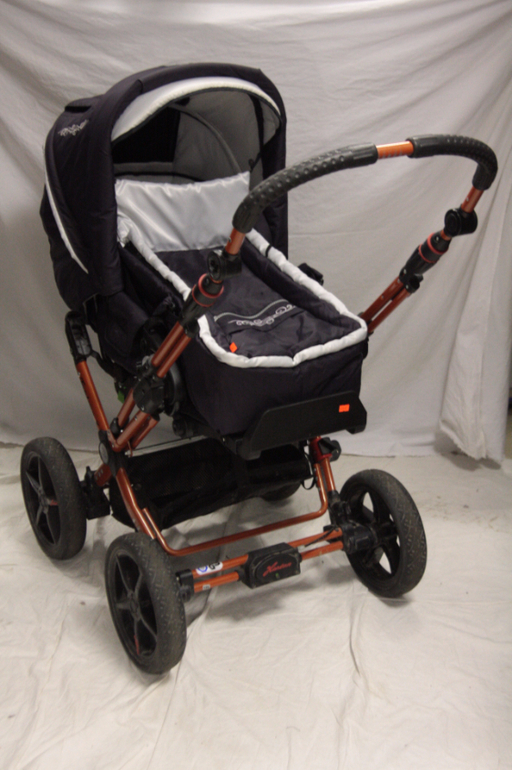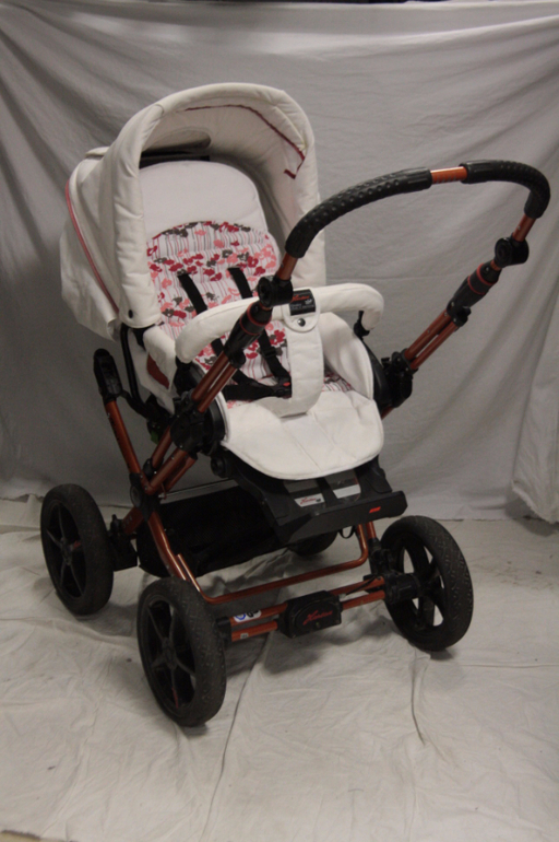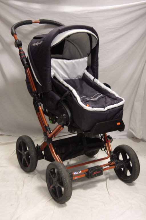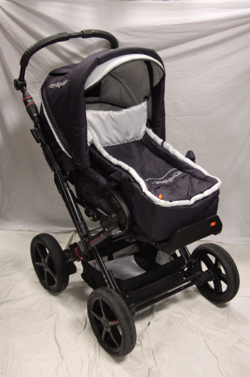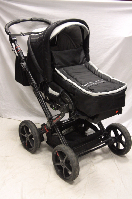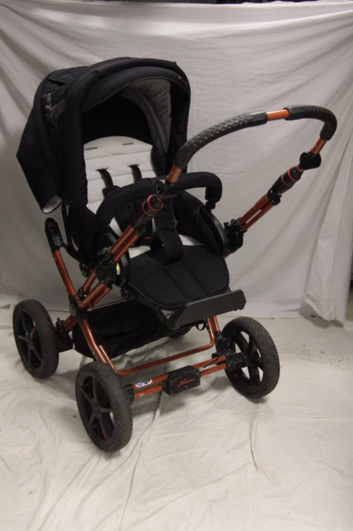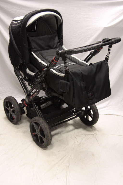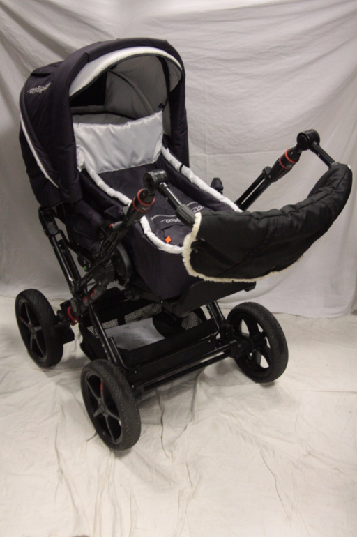 Эта коляска не поставлялась в Россию. Она сделана для Германии. Стильная черная рама. Текстиль украшен стразами. Люлька вставляется в прогулочный блок, то есть нет дополнительного блока - не занимает много места. Прогулочный блок отделан плюшем. Еще одну подобную коляску очень трудно будет встретить в городе.