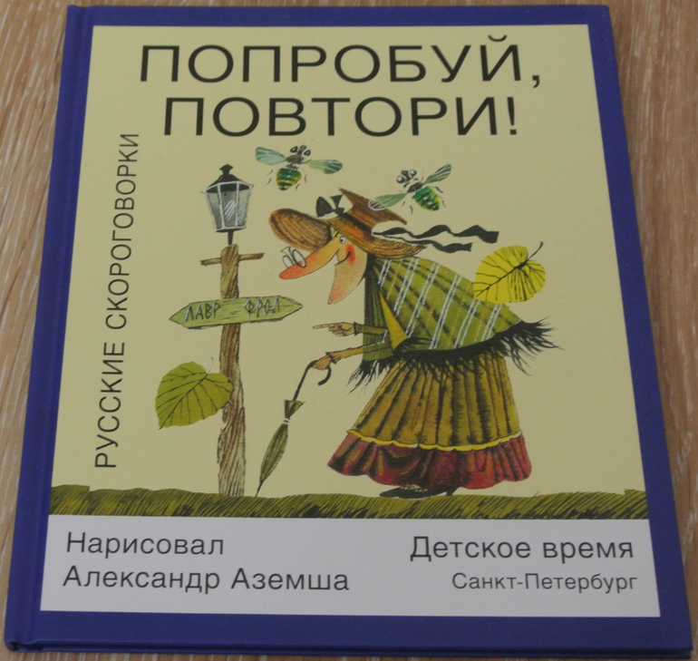 Попробуй, повтори. Русские скороговорки - я так и не поняла, как я купила эту книжку:))). Она мне приглянулась сразу, но я точно помню, что кинула ее в "отложенные". Потому что в последнее время воздерживаюсь от покупки книг 20-30 страниц в твердом переплете. Плюс (точнее - большой минус) - это ее цена, неоправданно высока. Несмотря на замечательные иллюстрации Аземши. Сын их кстати сразу узнал: "как в моей черной книжке". И мне не совсем нравится оформление обложки (ну это уж если совсем придираться). Рамочка, расположение надписей, белый фон... Журнально, имхо.