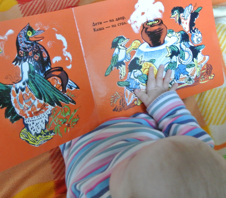 Сорока белобока с илл.Мавриной - нравится яркий красный цвет Все крути, вертит книжку-картонку. Следит за пальцем, когда показываю деток сороки (у нас они "кар, кар, кар"