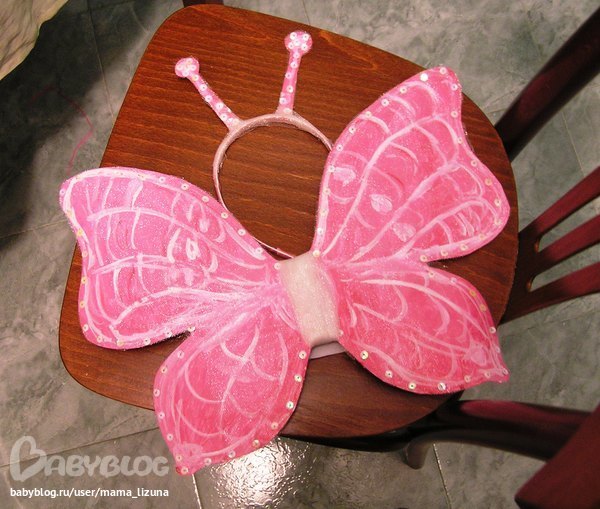 Я только что закончила для Лизы крылья бабочки и рожки. Делала все из картона, раскрашенного гуашью, затем обшила фатином с двух сторон через пайетки. Рожки по такому же принципу.