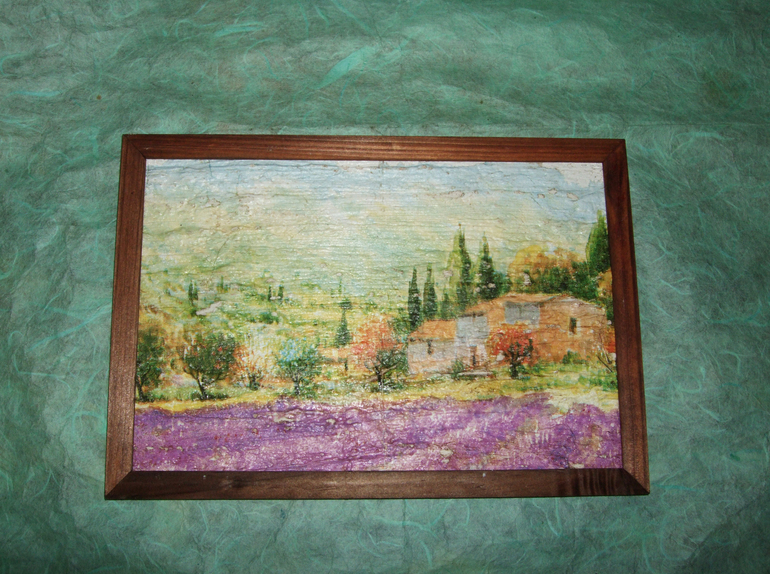 Сдаю долг. Значит так холст наклеила на картон, грунтовать не стала, хотелось мне как бы получить темную как будто сильно старую картинку. Наклеила фрагменты салфеток. И стала выкладывать шпатлевкой цветы у нарциса и листья у сирени. Когда подсохло, сверху наклеила снова цветы нарциса и листья сирени. Немного подрисовки, тонировки. Девульки там просматриваются зеленые пятнышки не смотрите на них, это рамка с витражной своей картинки сняла и так получилось что немножко с краской вместе. Рамку другую поищу конечно же для холста