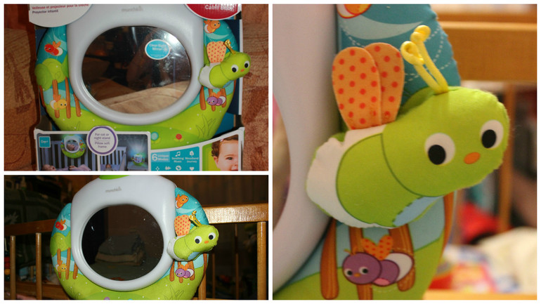Как я уже писала ночник с краю по кругу обшит очень приятной как для глаз так и по тактильным ощущениям тканью, там нарисованы веселые милые летающие пчелки, причем одна даже вылетела наружу, и ее можно вдоволь пощупать, ведь она выпуклая (крылышки сделаны из одной ткани, тельце и с другой, антенки-усики гладкими веревочками, для тактильного эффекта самое то). Веселая яркая пчелка наблюдает за монитором и составляет компанию крохе. По середке расположен монитор, в виде зеркала, отражающего как вашего маленькое чудо, так и обстановку возле него. Также на этом экране можно наблюдать в такт мелодии и звездам отражающимся на потолке лучики цвета (проявляются в разных местах на экране-зеркала), что довольно необычно.