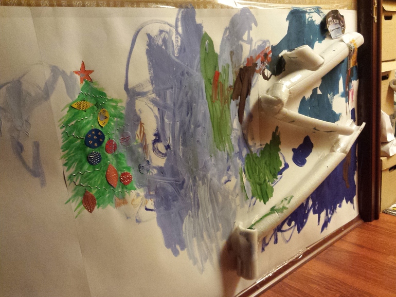 Вчера решили порисовать, не помню с чьей подачи, но он был согласен, что бывает нечасто. В итоге я нарисовала на ватмане на стене кусок стрелы крана, а потом отвлеклась. Тим пару раз подходил с просьбой открыть другую банку с краской (гуашь). Когда я вернулась, оказалось что масштабы рисования - 2 ватманских листа, приклеенных к стене, краска берется щедро, капая с кисти на пол, немного покрашен косяк двери и мой кран закрашен, вернее "раскрашен":). Я была рада, что до обоев дело не дошло, хотя наверное они бы отмылись.