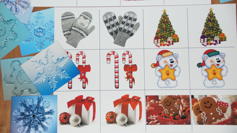 - Снежинки. Здесь подобраны настоящие макро-фотографии снежинок! Они прекрасны! Особенность задания в том, что, по сути, сортировать по парам карточки не нужно. Можно просто брать из стопки и показывать подряд. Снежинки все разные, но немного похожи. В это PhotoMemory мы играем уже недели две. Дочка в восторге от картинок! Всего 12 снежинок на листе А4.
