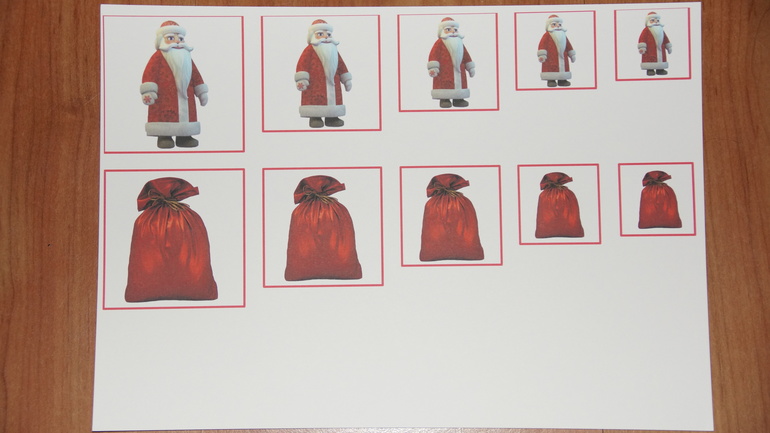 - расположи фигурки от размеру: например, большой Дед Мороз должен получить большой мешок и тд.